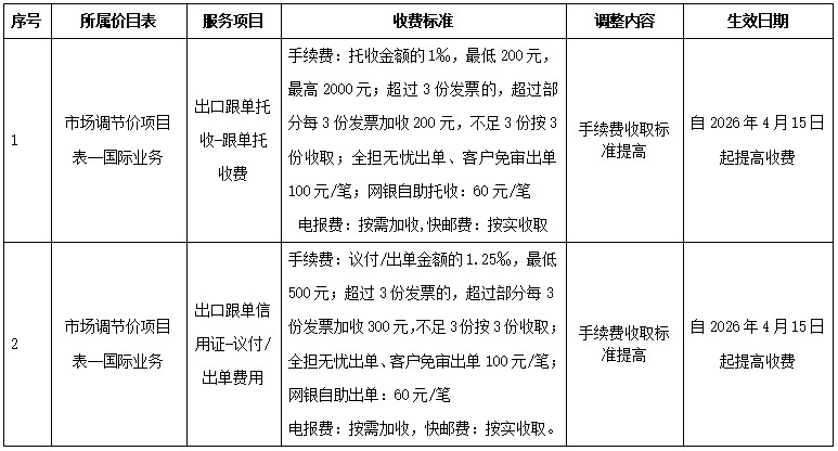 為了向您提供更加優(yōu)質(zhì)便捷的服務(wù),根據(jù)國家有關(guān)規(guī)定,我行擬調(diào)整部分收費項目并進行規(guī)范公示?,F(xiàn)將本次調(diào)整情況公告如下: